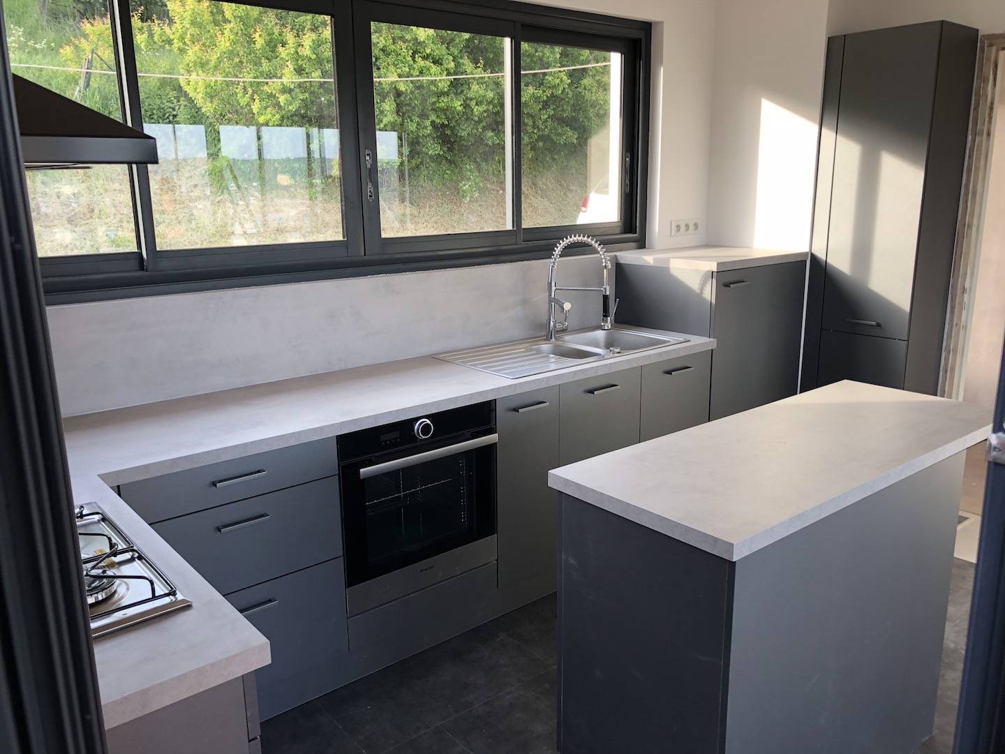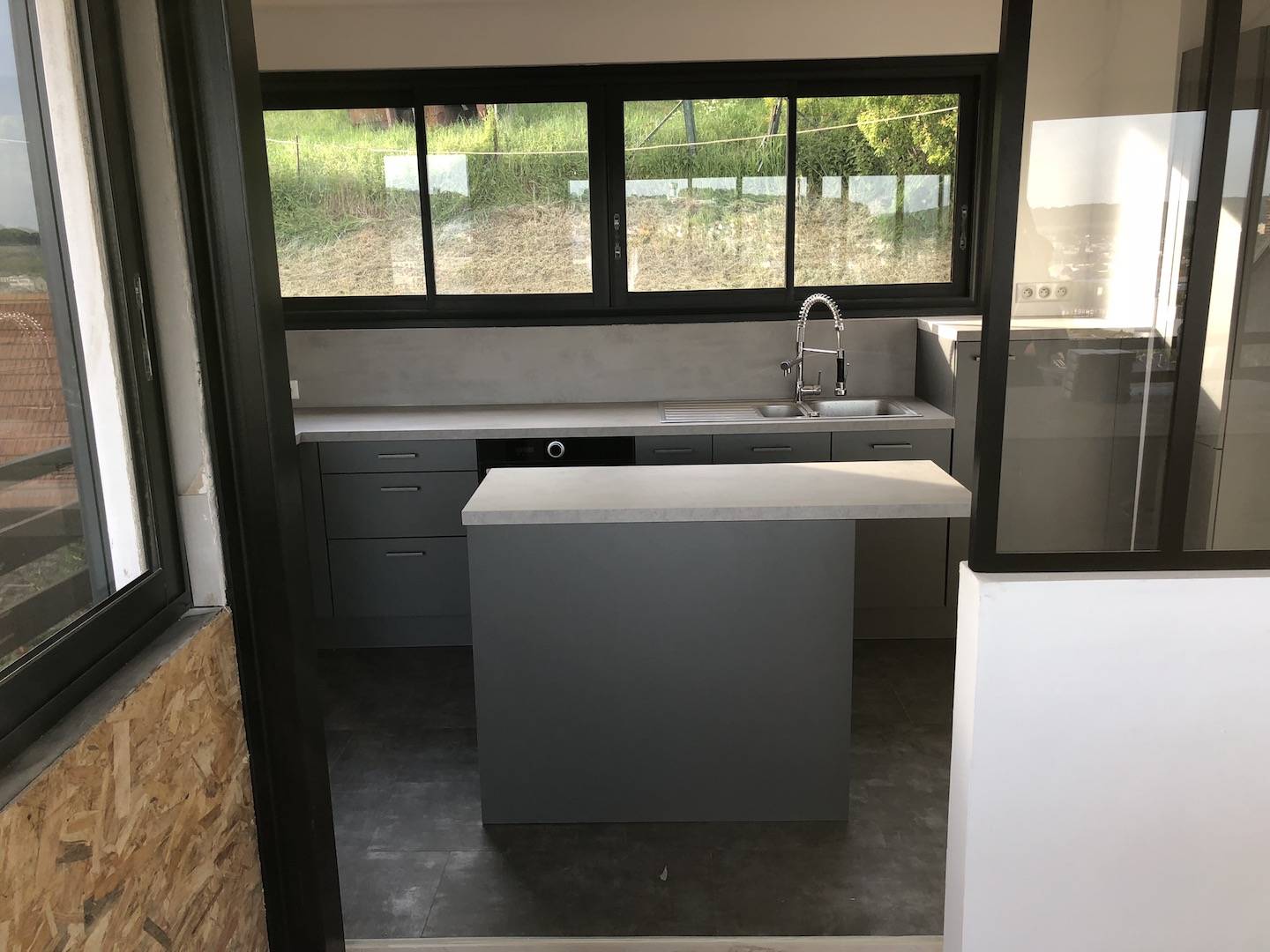 Cette cuisine aménagée est de marque Stormer, modèle Lava Metallique en mélaminé. Le plan de travail est aussi Stormer coloris Chromix Argent.
