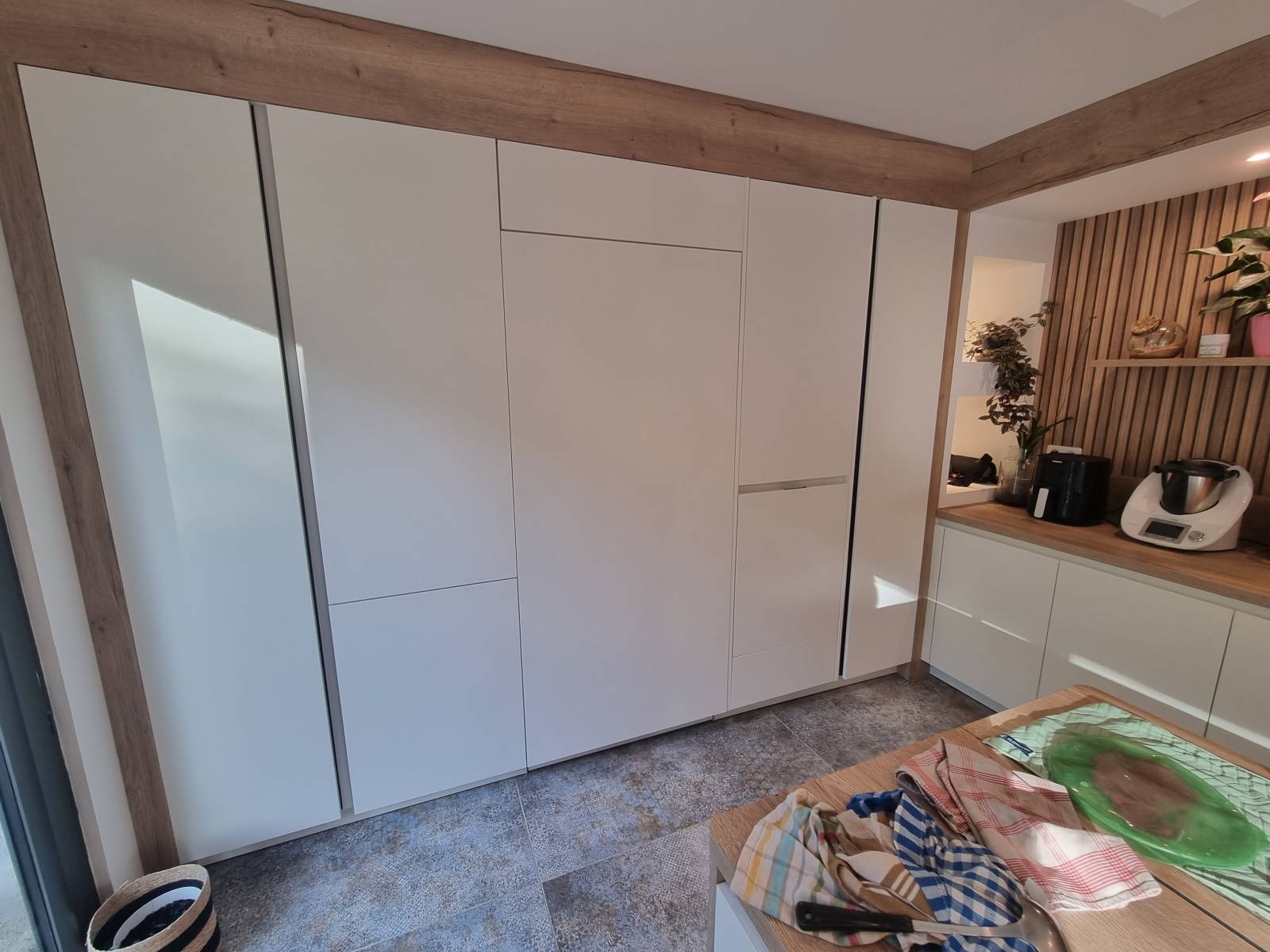Enfin le clou du spectacle la porte cachée. Niché au cœur du mur de colonne se trouve un porte de 90 cm de large et de 2400 de hauteur. A première vue elle n'est pas visible mais pourtant permet l'accès à la buanderie derrière la cuisine. Même si cela n'est pas disponible partout sachez que notre enseigne est spécialisée dans ce genre de réalisation