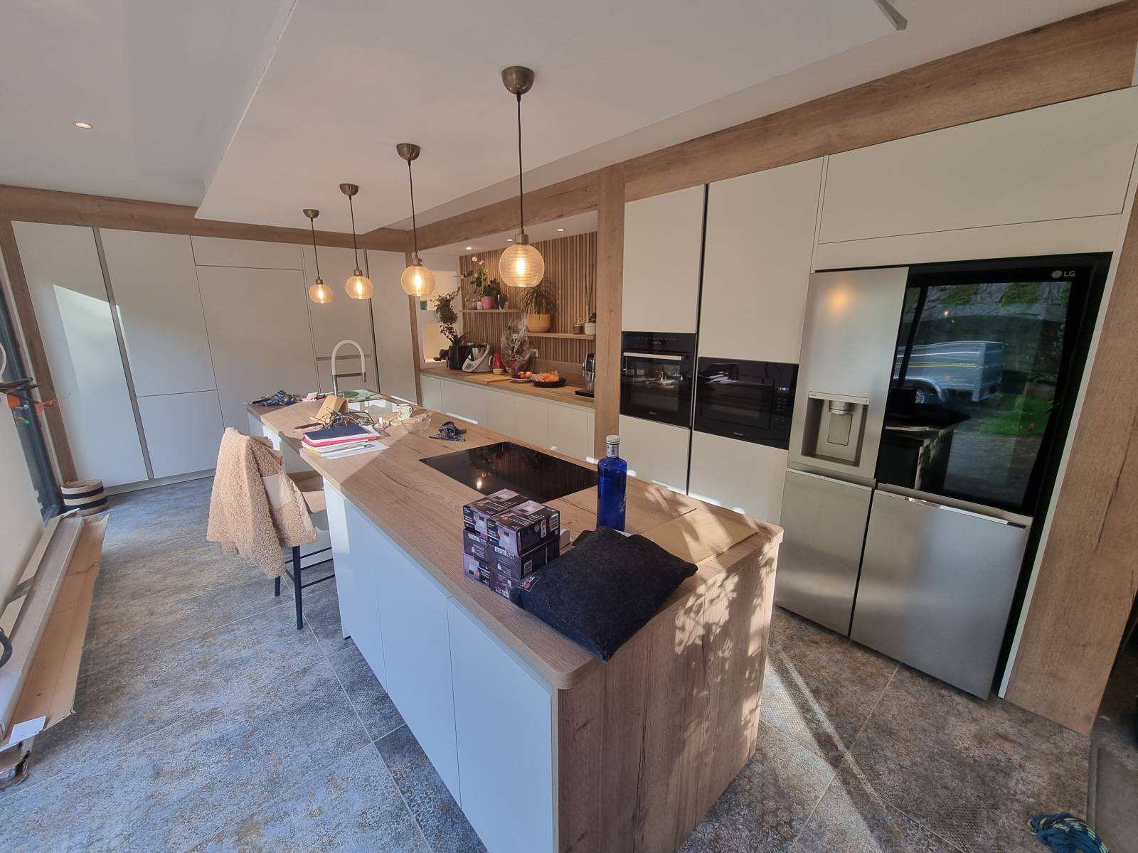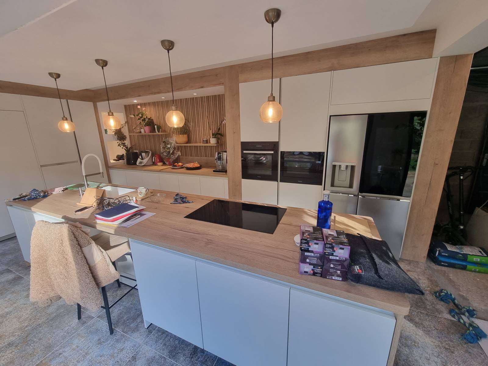 Pour cette cuisine, nous avons opté pour un énorme ilot central de 4 mètres de long sur 1,2 mètre de profondeur. Belle pièce !!