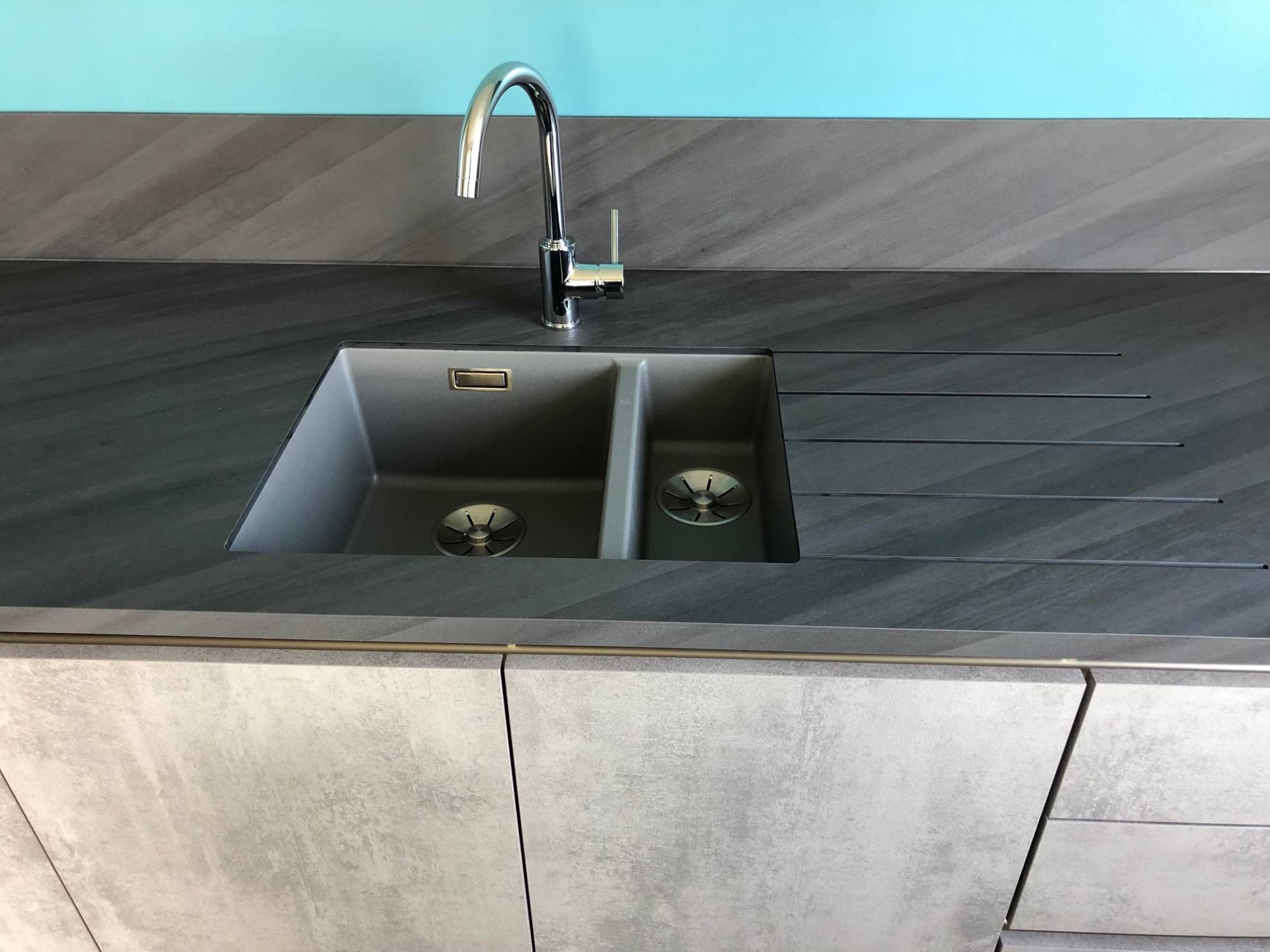 L'accord entre le coloris du plan de travail et celui des façades est parfait ! Un grand bravo aux clients pour le choix du coloris du mur du fond qui souligne encore d'avantage la façade en béton ciré.