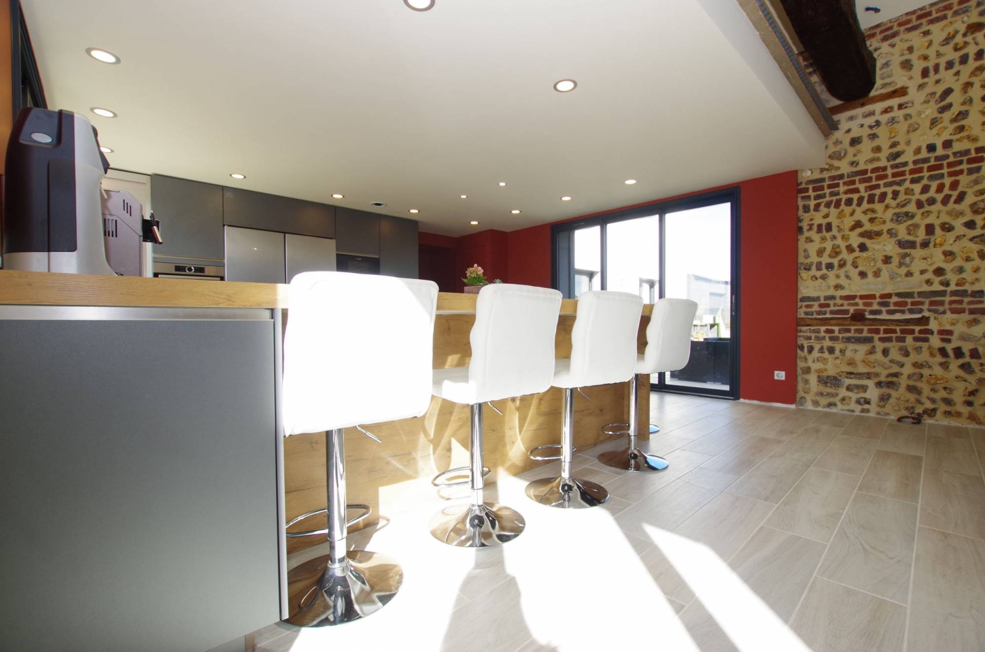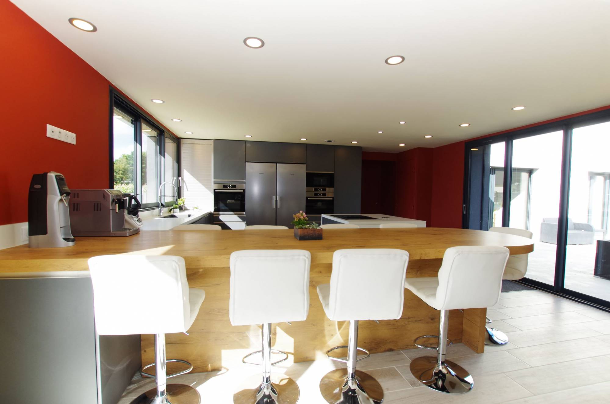 Chose différenciante dans cette cuisine : la table à manger aux proportions immeuble posée sans pied ! qui à une double utilité, tout d'abord, elle sépare la cuisine de la salle et permet à cette famille nombreuse de manger tous les jours dans leurs cuisine.