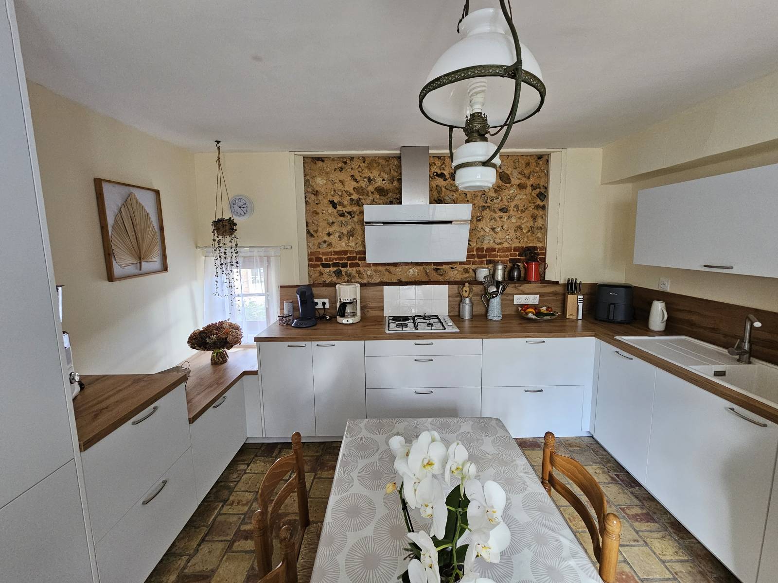 Nous avons abaissé une partie de la cuisine afin de permettre l'ouverture des fenêtres. afin d'allié au mieux le contemporain et le traditionnel, la hotte est posée sur le mur en brique et silex d'origine ! L'effet Waouh est au rendez vous !