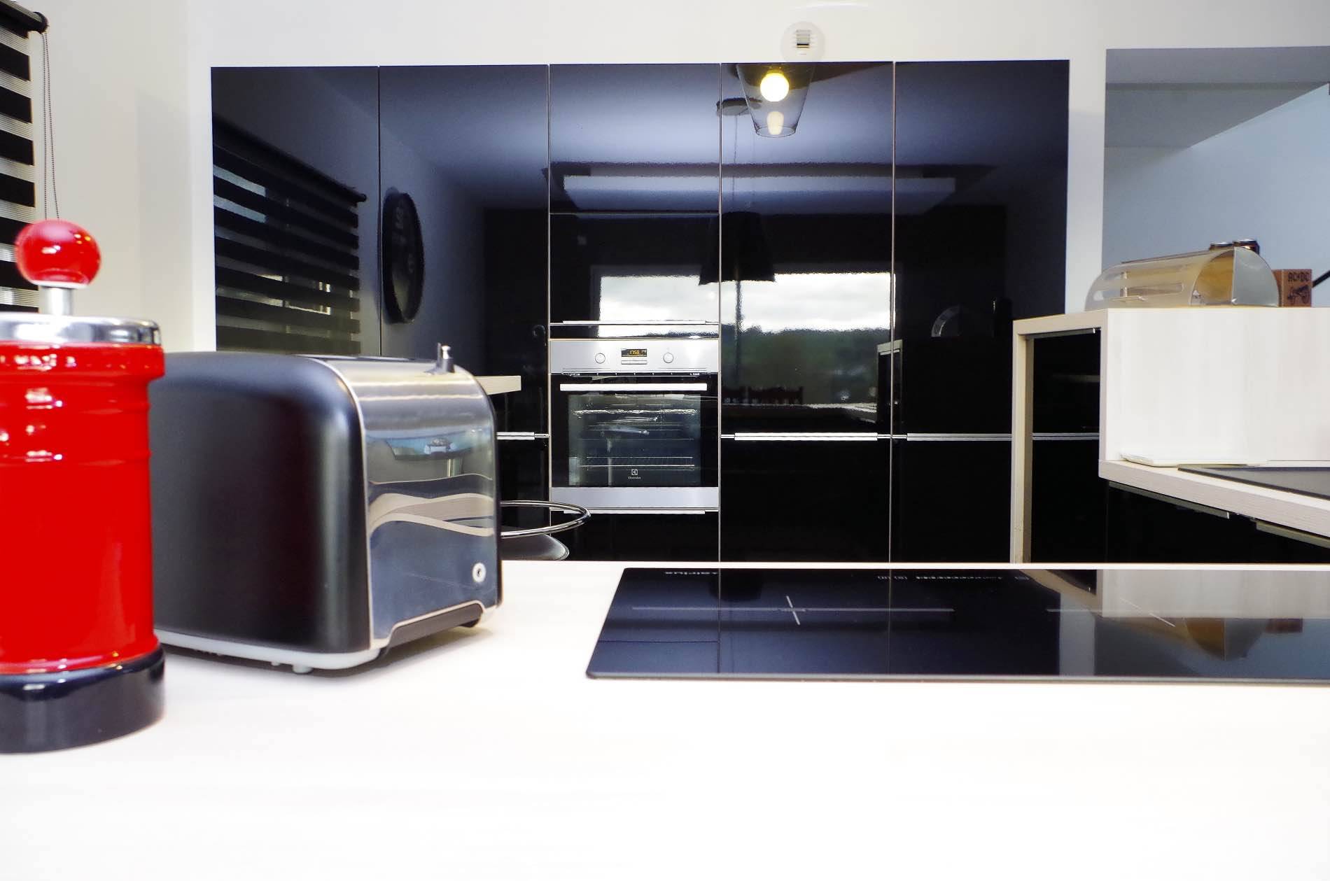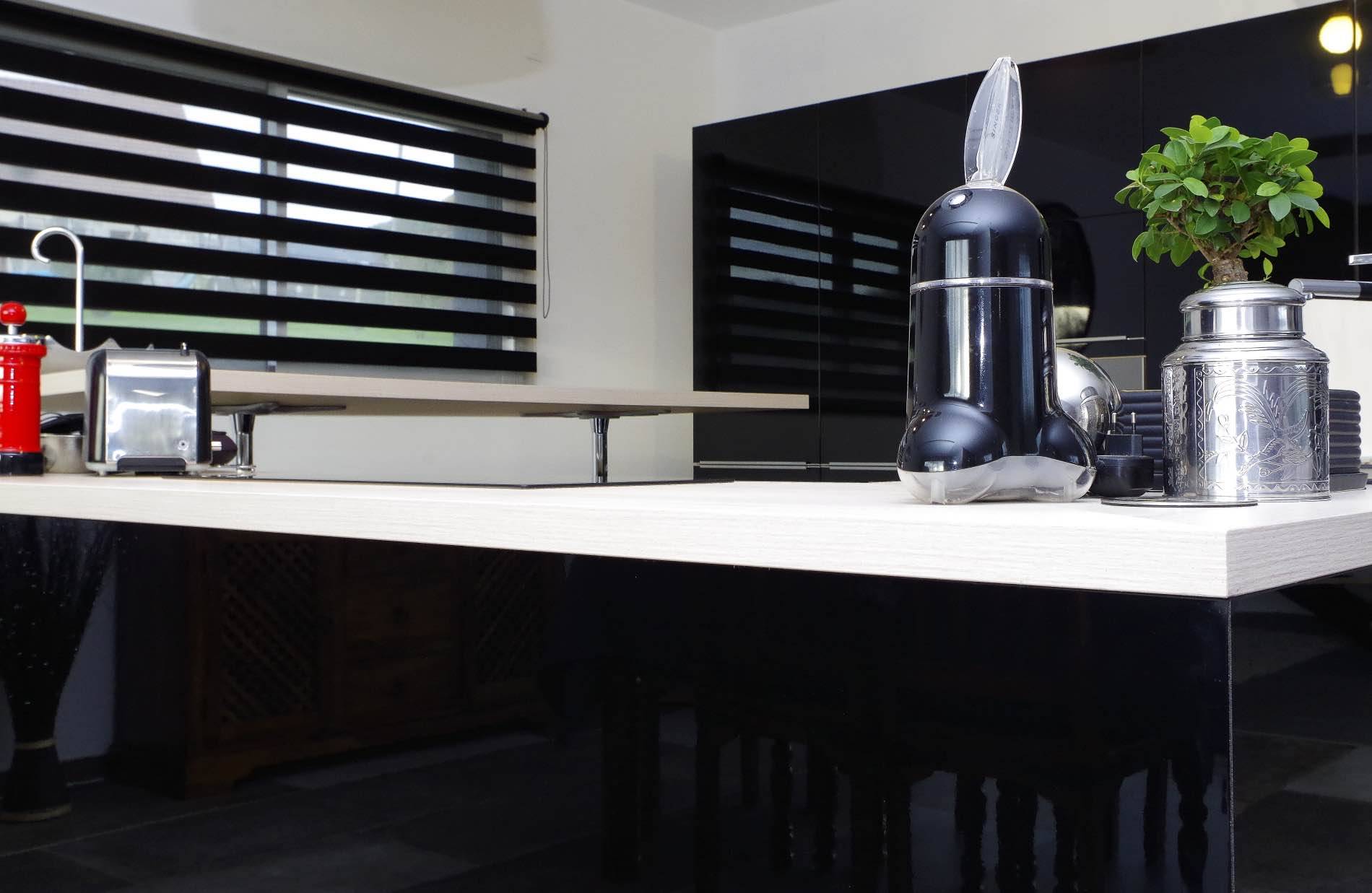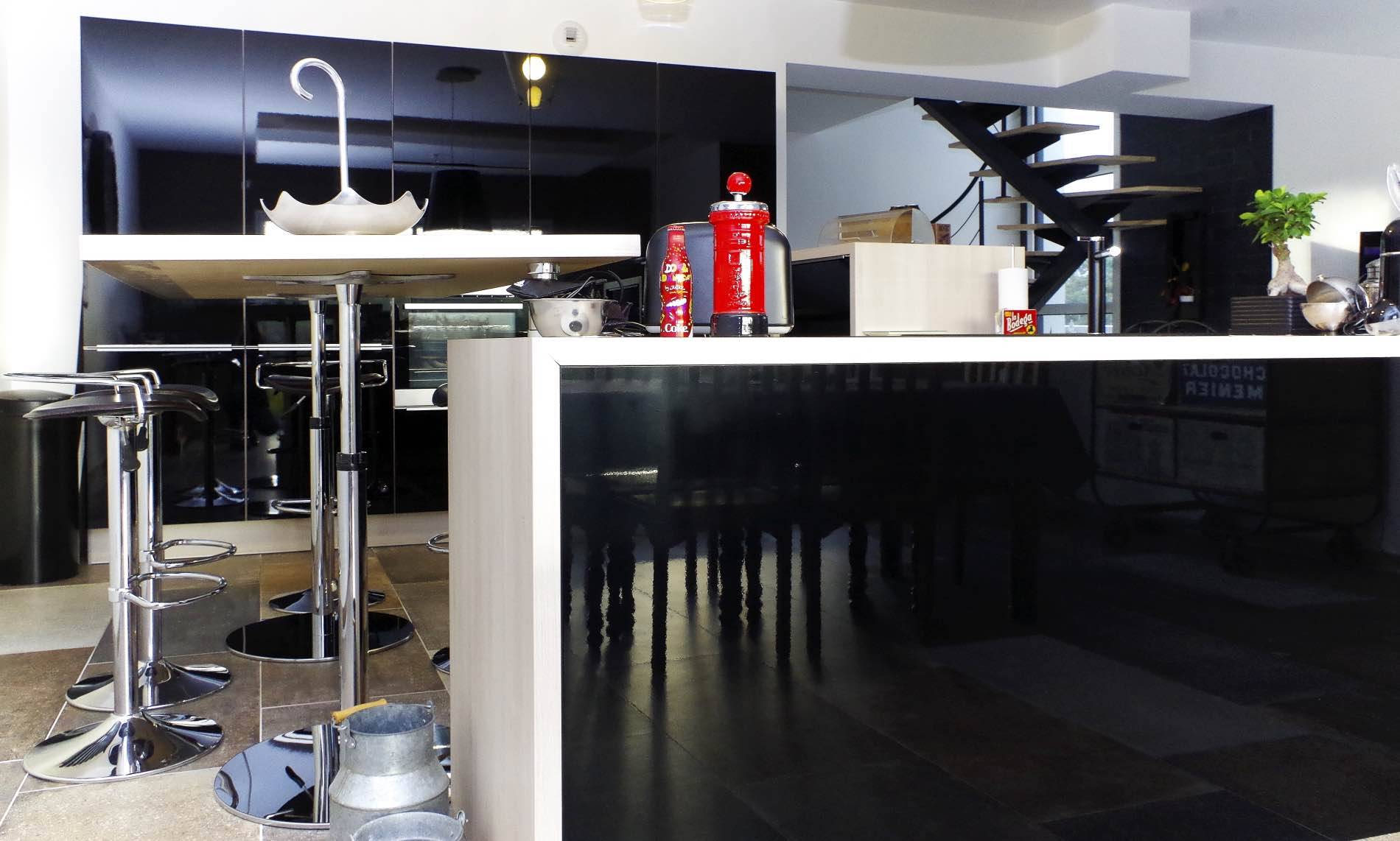 Cette cuisine brillante à la particularité de ne reposer sur aucun mur ! C'est une sorte d'îlot avec retour en forme de U.