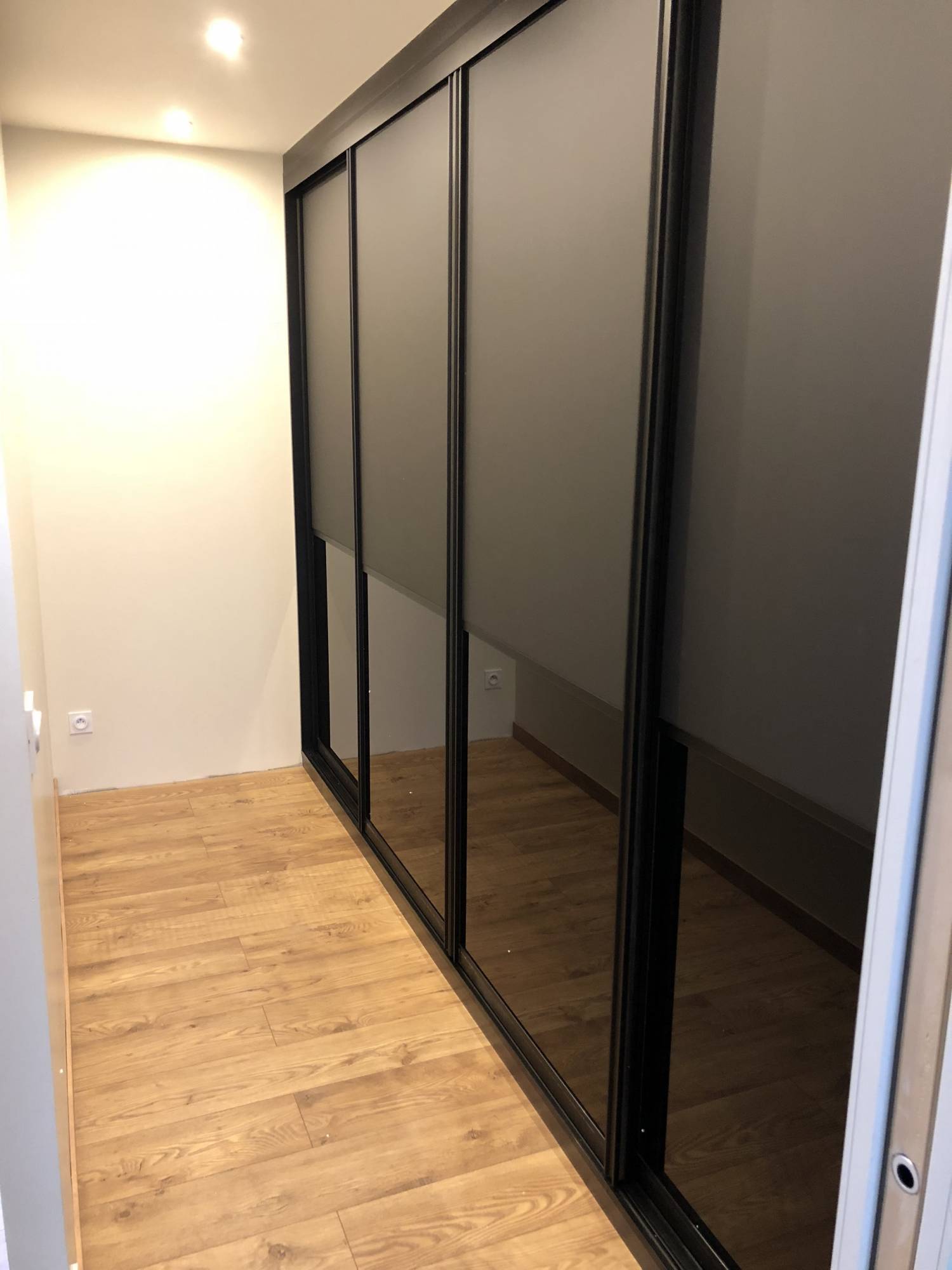 Encore une magnifique réalisation de la part de Premier Plan Fecamp. Ce Dressing est composé de 2 matières pour les portes de placard, le haut est en stratifié Noir Mat et le bas en verre laqué noir Brillant.