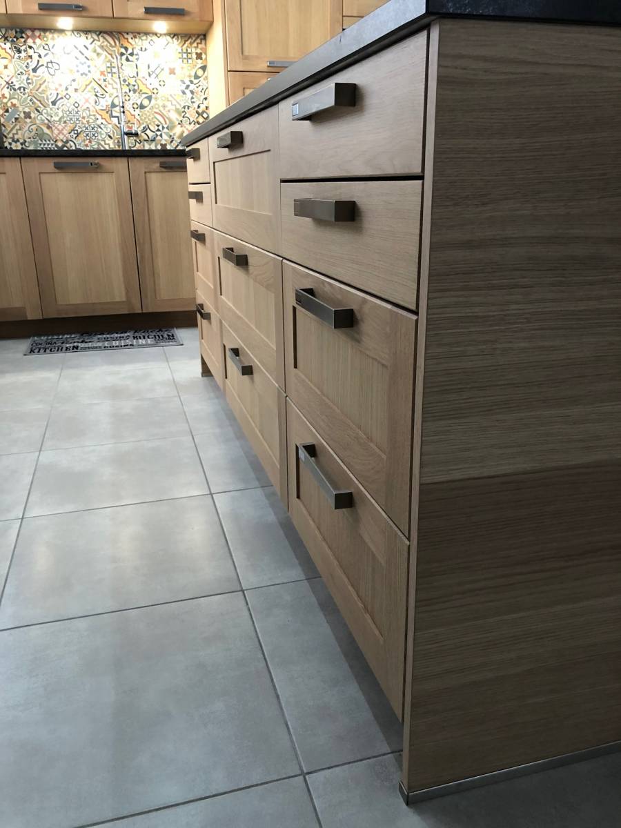 Cette cuisine en bois classique n'a rien d'une cuisine traditionnelle. Les façades sont en bois et à cadre ce qui donne un côté chaleureux à la pièce. Elle est très spacieuse, ce qui a permis aux concepteurs d'insérer un petit plan de travail aspect pierre avec le coin évier intégré. Un deuxième plan de travail en ilot central a été rajouté en plein milieu de la pièce, dans l'esprit de proposer au client une grande surface disponible pour préparer ses plats. Des prises ont été aussi implanté pour rendre le plan de travail très pratique, vous pourrez tous faire sur cet ilot central. La plaque de cuisson est elle aussi intégrée à l'îlot central.