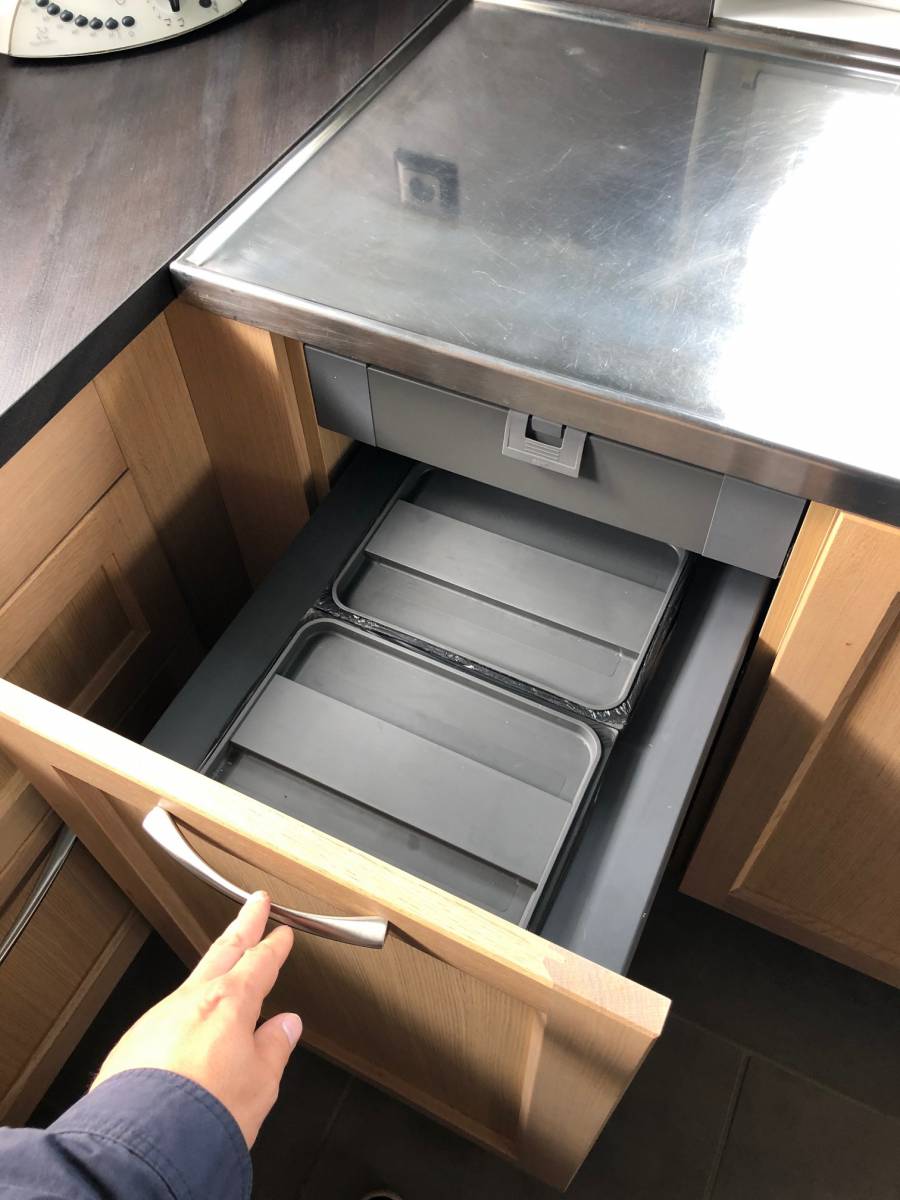 Nous retrouvons aussi la petite signature de chez nous : le meuble-poubelle. Ce rangement est omniprésent dans nos réalisations car il est extrémement pratique et ainsi vos poubelles seront ranger et non à la vue de vos invités.