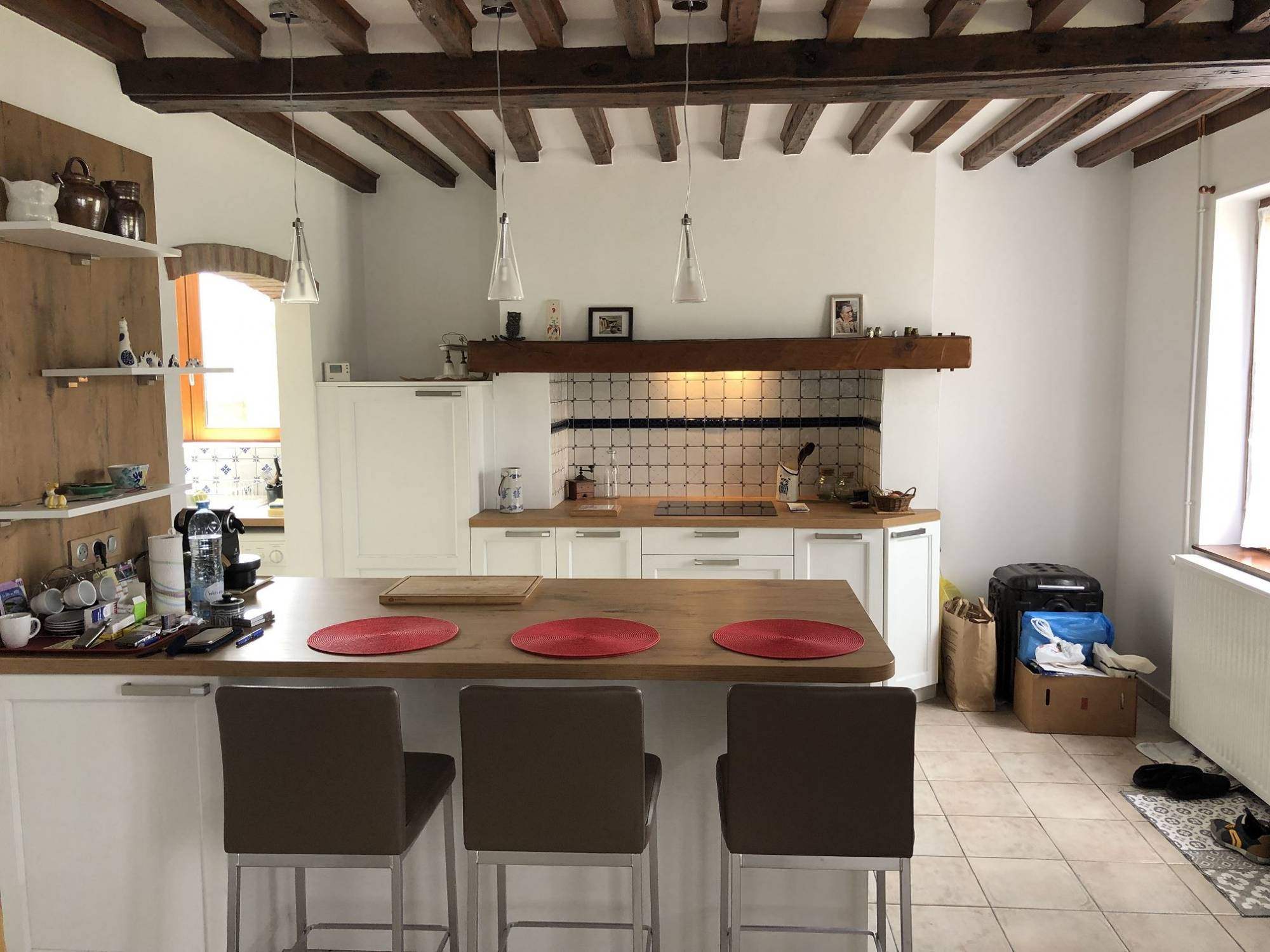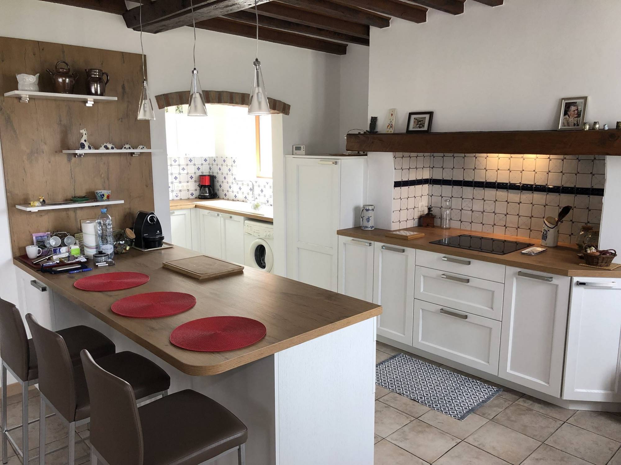 Cette cuisine en bois massif blanc s'intègre parfaitement à la maison