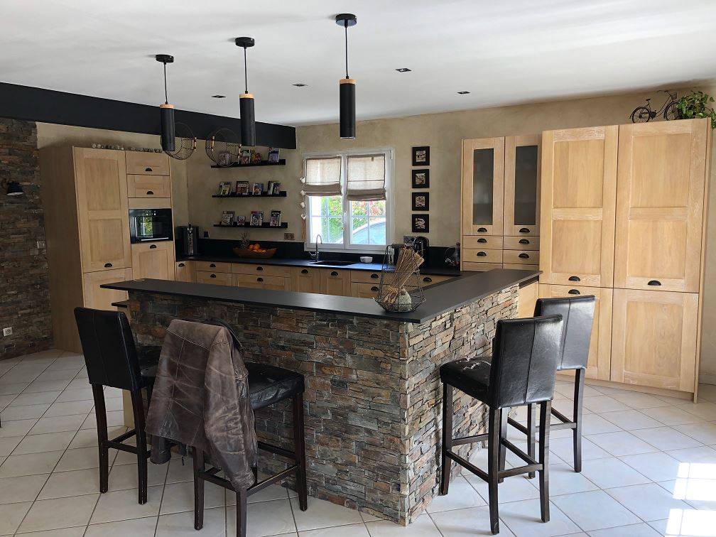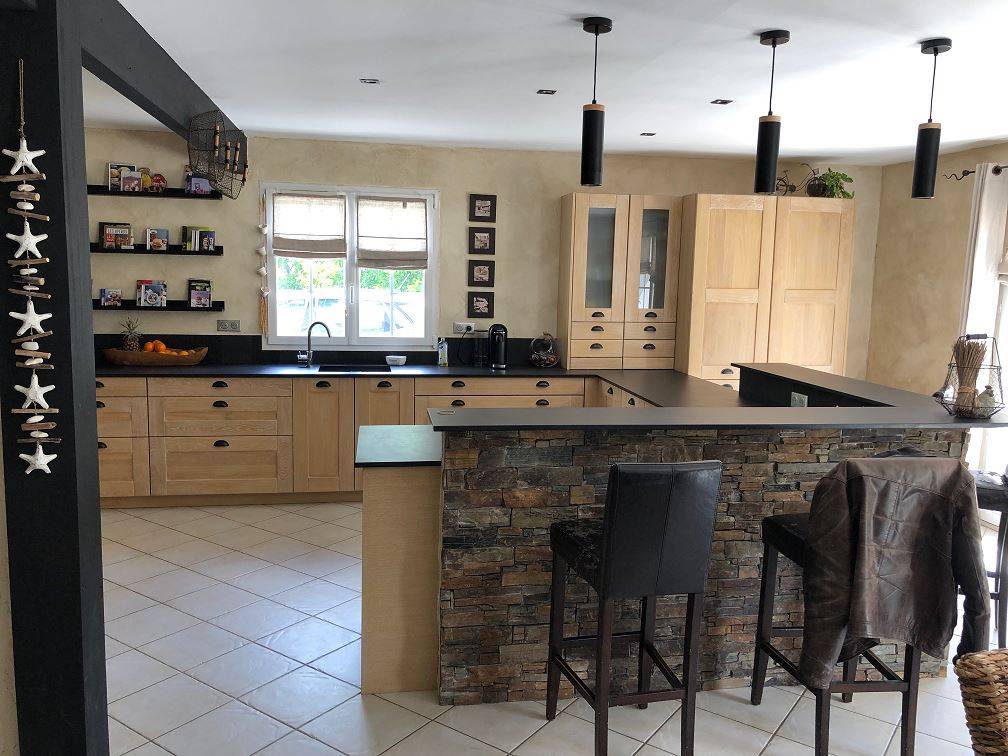 Cette cuisine en Bois massif s'harmonise parfaitement avec le mur en pierres et le plan de travail en DEKTON noir mat. (assez facile d'entretien d'après les dires de la cliente)